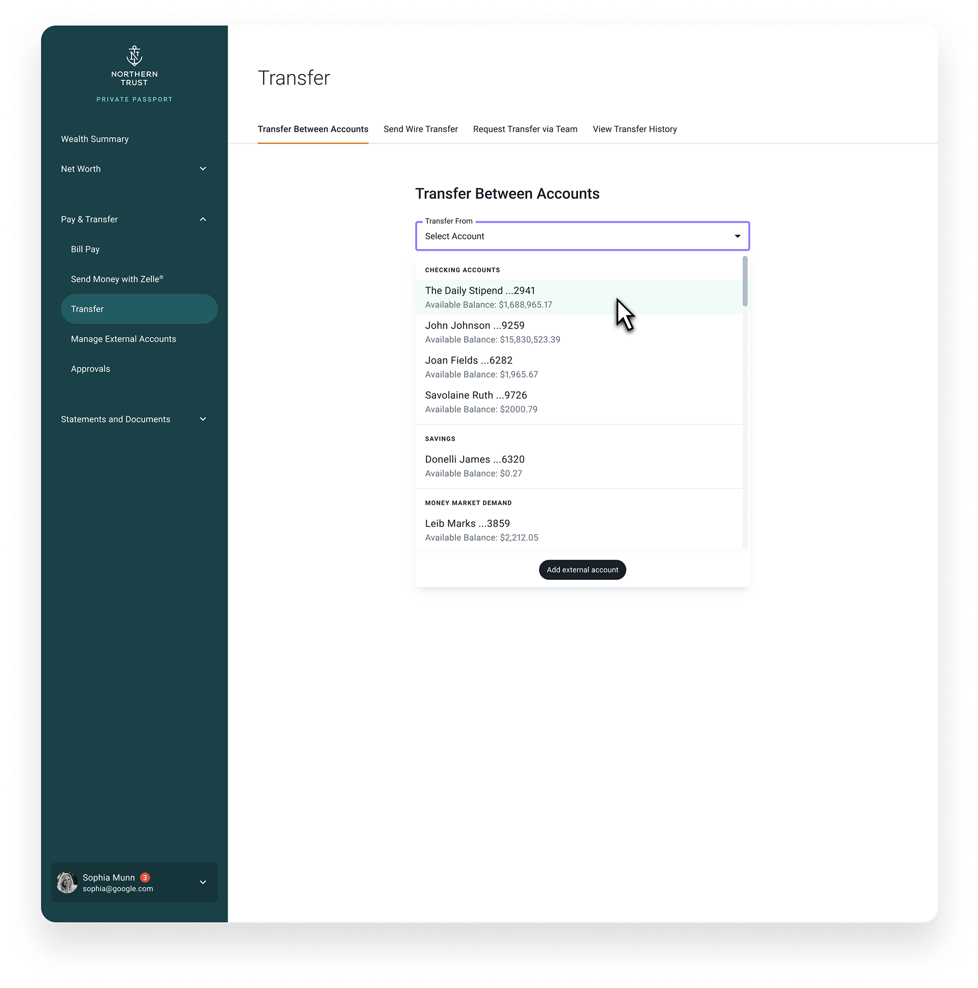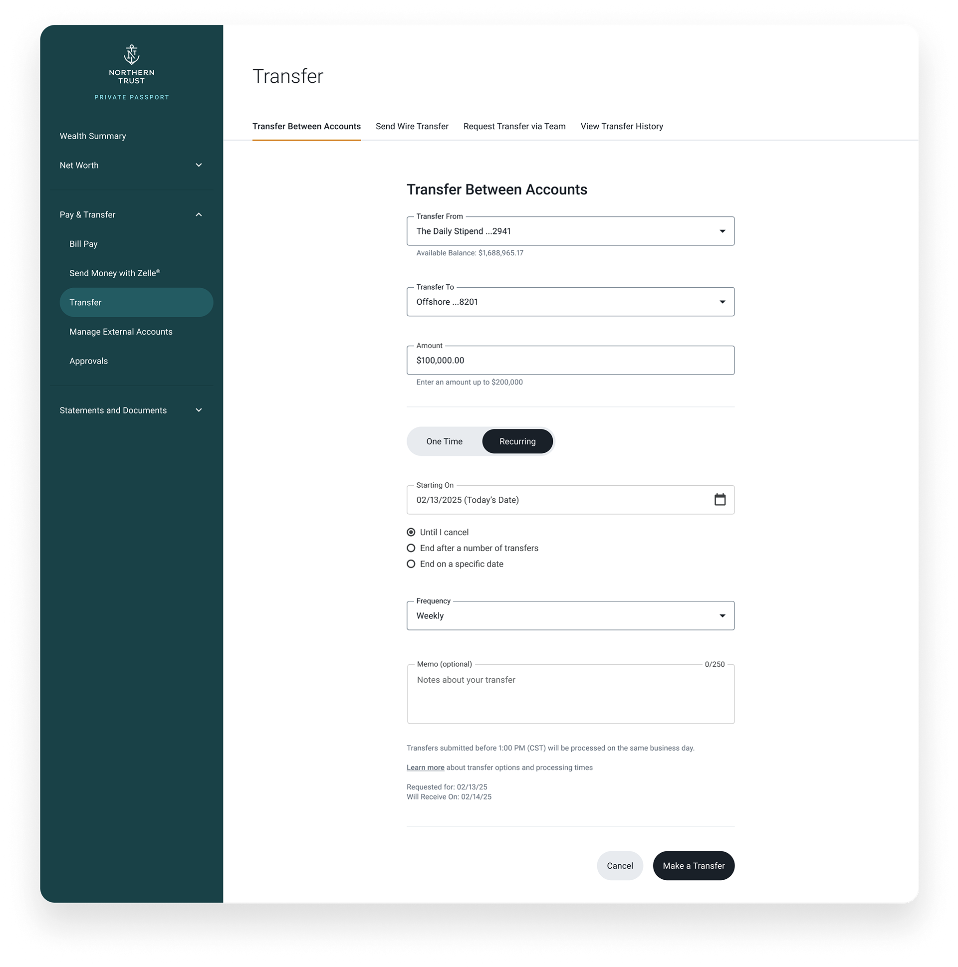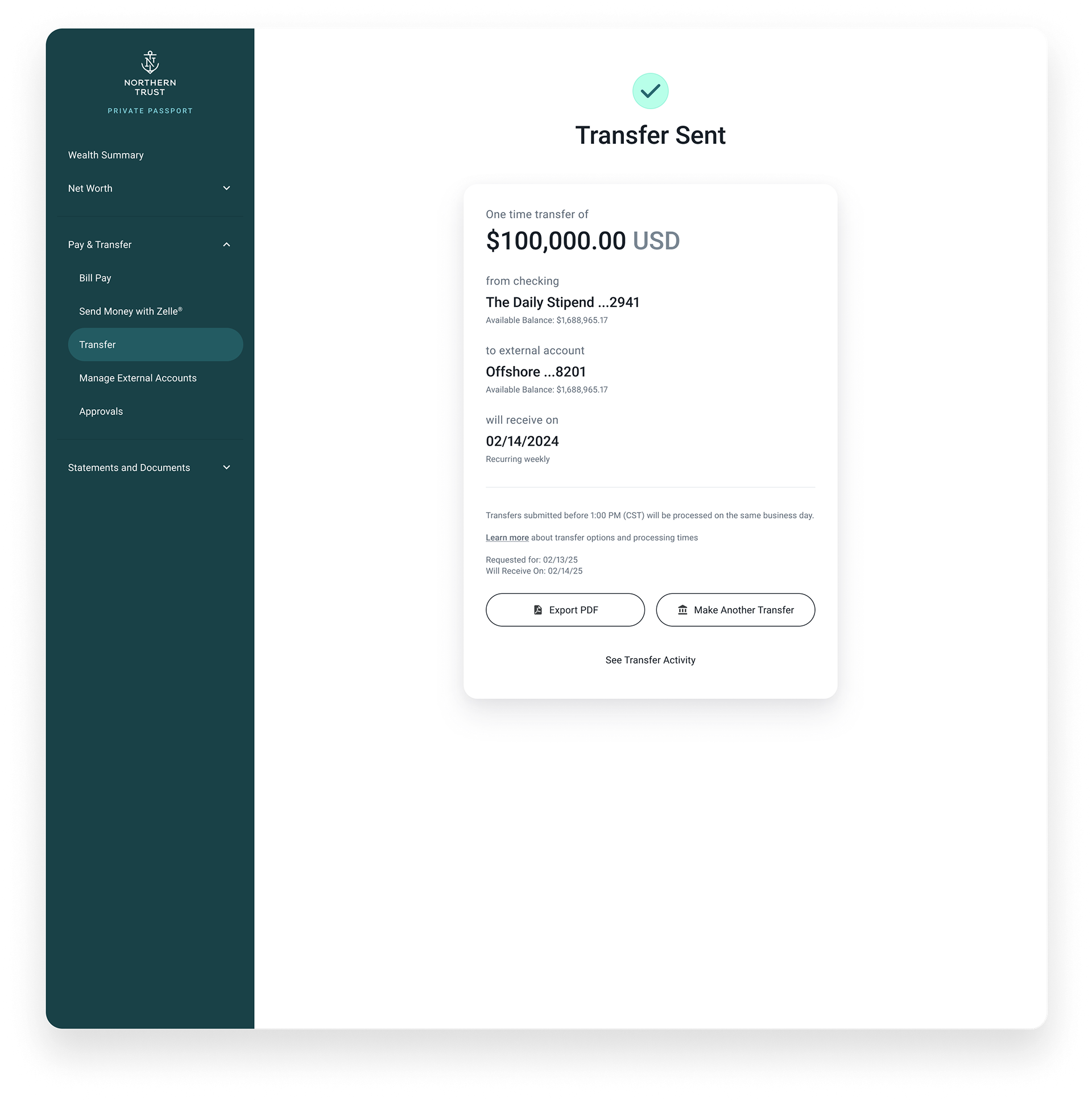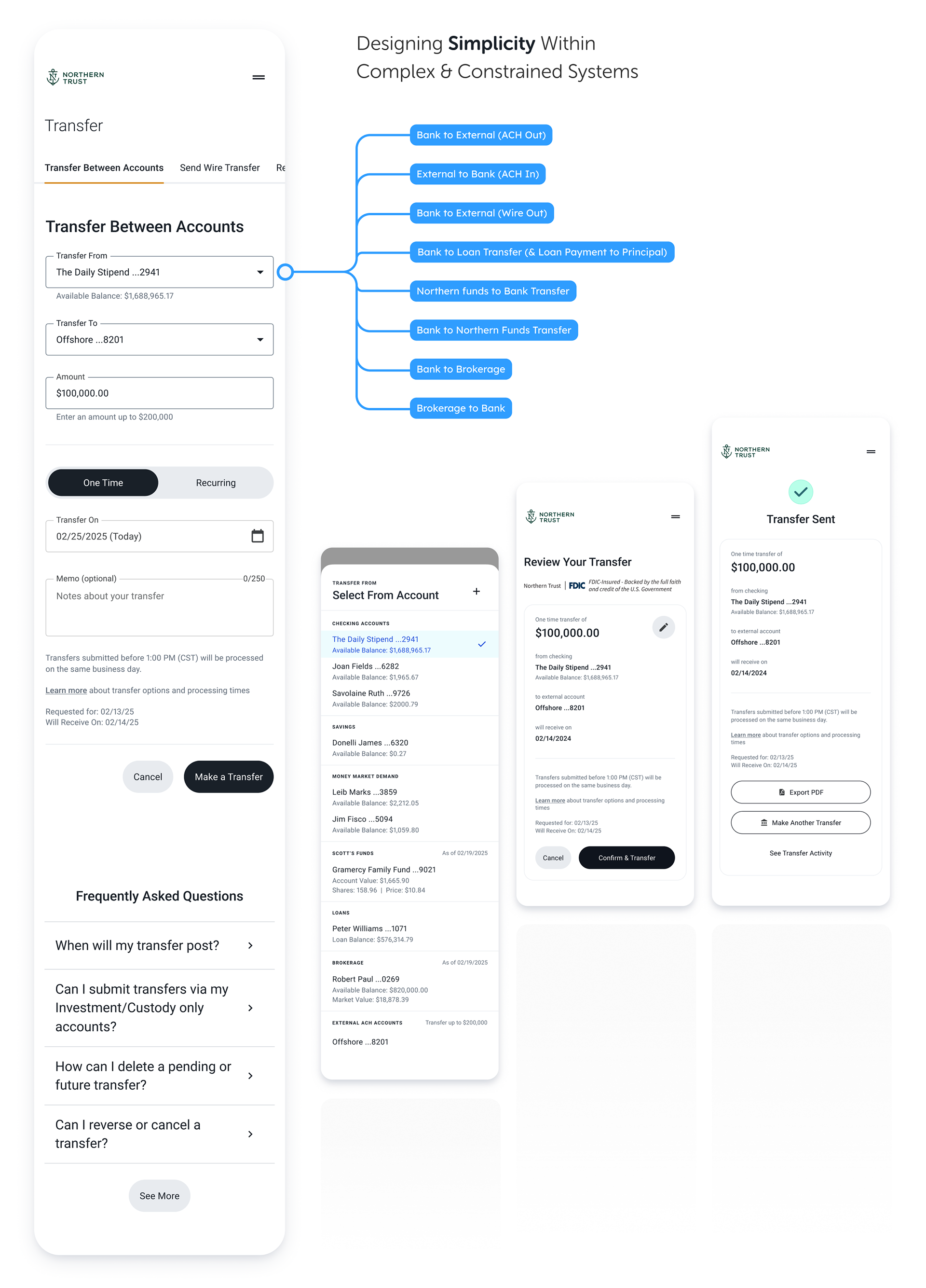 We were replatforming with the new P2NxT design system, working within strict requirements that shaped much of the UX architecture. Partnering closely with the product owner, we balanced technical feasibility with forward-thinking UX principles—introducing clearer labeling, visible balances, and a more intuitive way to navigate between account transfers and wire transfers. The most complex challenge was designing variable display states for multiple transfer flows, each with unique logic, while keeping the experience consistent and seamless across the platform.