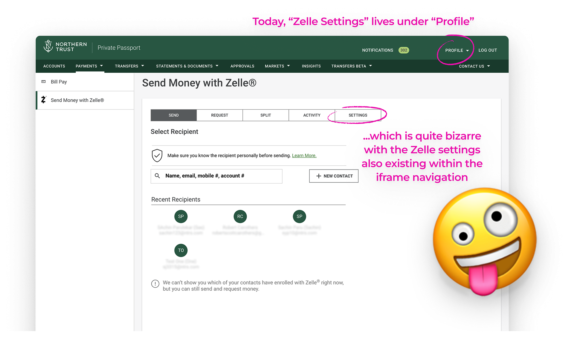 Integrating Zelle into the P2NxT design system was a critical step toward maintaining consistency and brand integrity across Northern Trust’s digital ecosystem. Unfortunately, much of the existing experience relied heavily on iframes—Zelle in an iframe, bill pay in an iframe, debit card management in an iframe. Nearly every third-party integration lived inside a box, creating a fragmented and visually disjointed experience for clients who expect more from a global private bank.